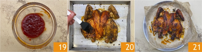 Reserve o molho agridoce 19. Após o tempo de cozimento, retire o frango do forno e pincele-o com o molho agridoce 20. Perfume com algumas folhas de manjerona fresca e leve ao forno novamente por 10 minutos, aumentando a temperatura para 220°. O seu frango à diavola com molho agridoce está pronto para ser servido 21!