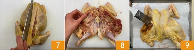 Agora, pegue o peito de frango e remova o osso central 7, em seguida, abra as 2 partes e achate 8. Coloque o frango assim achatado em uma assadeira forrada com papel manteiga com a pele voltada para cima e pincele a superfície com o rub 9. Deixe descansar em um local fresco por 30 minutos.