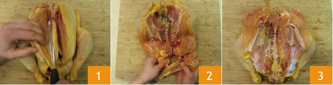 Para preparar o frango à diavola, a primeira coisa a fazer é pegar um frango inteiro e cortar ao meio a parte do esterno 1. Remova o osso central 2 e abra completamente o frango 3.