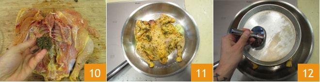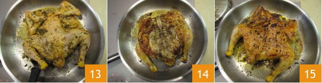 Cozinhe em fogo baixo por cerca de 25 minutos sem nunca mexer. Em seguida, vire o frango 13 e você notará que se formou uma bela crostinha. Cozinhe por mais 25 minutos, sempre garantindo que o peso pressione bem o frango no fundo da frigideira, até que o outro lado também esteja bem dourado 15. Durante o cozimento, você não deve girar ou mover o frango.