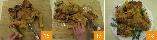 Nesta etapa, transfira o frango para uma tábua de corte e, usando uma tesoura de cozinha, corte-o primeiro ao meio 16 e depois em pedaços 17. Transfira os pedaços de frango para um prato de servir e sirva 18.