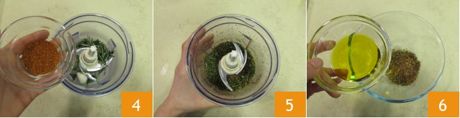 Neste ponto, transfira para um processador de alimentos o sal, as ervas aromáticas, o alho e a pimenta (abundando na quantidade se preferir: a indicada dará uma picância média) 4. Bata tudo 5 e despeje em uma tigelinha. Adicione 25 g de óleo 6