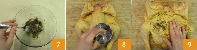 e misture com uma colher até obter uma pasta 7. Utilizando um amaciador de carne, achate levemente o frango. Massageie o frango com a mistura recém-preparada, espalhando-a tanto na pele