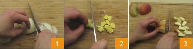 Para preparar o frango ao curry com maçãs, primeiro limpe a cebola e fatie-a 1, descasque também o gengibre fresco e pique-o 2. Lave, depois corte a maçã em pedaços irregulares de cerca de 2 cm mantendo a casca 3.