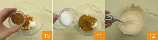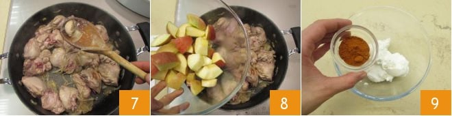 Vire o frango para dourar bem todos os lados e depois retire o alho 7. Adicione então os pedaços de maçã 8 e misture tudo. Continue cozinhando e enquanto isso, em uma tigela, misture o iogurte, a pimenta em pó 9,