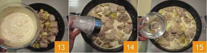 Uma vez que o frango estiver levemente dourado, despeje o molho de especiarias 13, salgue 14, adicione a água 15