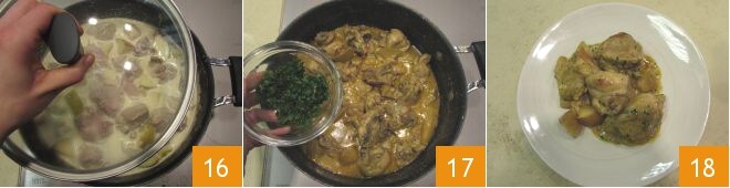 e cozinhe com a tampa 16 por pelo menos 20 minutos em fogo médio (mexendo a panela de vez em quando para não deixar o frango grudar no fundo). Após os vinte minutos, retire a tampa e continue cozinhando por mais 10/12 minutos. Passado esse tempo, adicione a salsinha picada 17 e o frango ao curry com maçãs estará pronto, sirva bem quente 18!