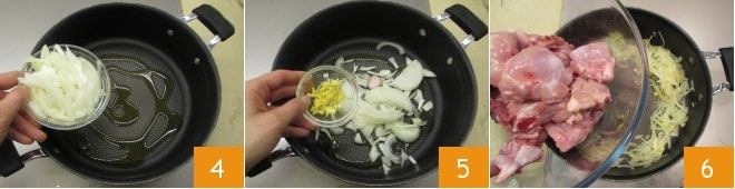 Regue com um fio de óleo na panela, adicione a cebola 4, um dente de alho e o gengibre 5 e frite em fogo baixo. Quando a cebola estiver suficientemente murcha, aumente o fogo e doure os pedaços de frango 6.