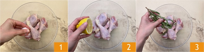 Para preparar o frango assado com batatas e cebolas, coloque o frango em uma tigela grande e adicione o sal 1, o suco de limão 2 e o ramo de alecrim 3. Misture e deixe o frango marinar por cerca de 20 minutos.