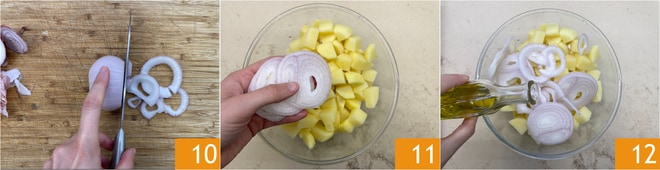 Limpe e fatie as cebolas com uma espessura de meio centímetro 10, depois despeje-as na tigela com as batatas 11 e tempere com azeite 12.
