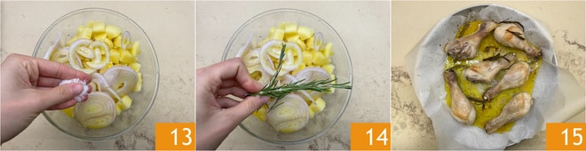 Tempere com sal 13 e alecrim 14. Retire o frango do forno após os 40 minutos de cozimento 15.
