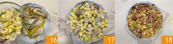 Adicione também as batatas e cebolas 16. Continue o cozimento ainda no forno estático, na prateleira do meio, a 220° por mais 40 minutos. 17. Retire o frango assado com batatas e cebolas do forno e deixe esfriar um pouco antes de servir à mesa 18.