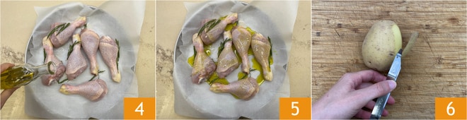 Transfira o frango para uma assadeira forrada com papel manteiga, regue com azeite de oliva extra virgem 4 5 e asse no forno estático, já aquecido, a 220° na prateleira do meio, por 40 minutos. Enquanto isso, descasque as batatas 6.