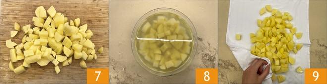 Corte-as em pedaços 7. Coloque as batatas em uma tigela com água por 30 minutos 8 para remover o excesso de amido. Escorra e seque as batatas 9.