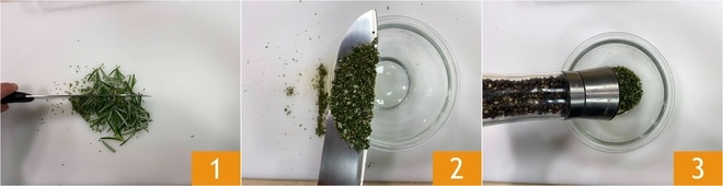 Para preparar o frango assado com legumes torneados, a primeira coisa é dispor sobre uma tábua de cortar o tomilho e o alecrim. Pique-os finamente 1 e transfira-os para uma tigelinha 2, depois adicione a pimenta 3.