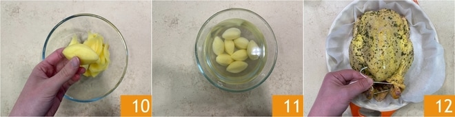 Você deverá obter uma forma arredondada com as extremidades pontiagudas 10. À medida que as prepara, coloque as batatas em uma tigelinha com água para não escurecerem 11. Em seguida, coloque o frango em uma assadeira e amarre as coxas juntas com barbante de cozinha 12.