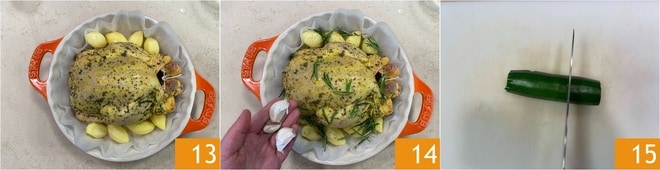 Disponha ao redor as batatas 13, tempere com um fio de óleo, sal e pimenta (apenas nas batatas) e adicione os dentes de alho com casca 14. Cozinhe em forno estático pré-aquecido a 200° por 60 minutos. Enquanto isso, prepare também os outros legumes: lave as cenouras e as abobrinhas, depois apará-las e corte-as em pedaços 15.