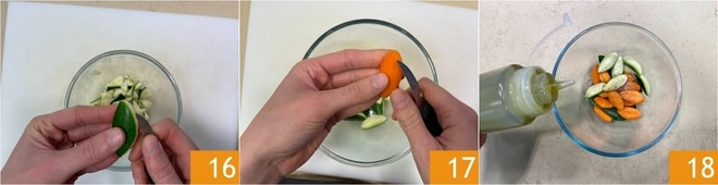 Torneie tanto as abobrinhas 16 quanto as cenouras 17 como fez com as batatas. Transfira-as para uma tigelinha e tempere com sal, pimenta e óleo.
