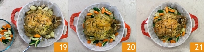 Após a hora de cozimento, coloque ao lado do frango também estes legumes 19, dispondo-os ao redor sem sobrepô-los demais 20. Cozinhe por mais 15-20 minutos. Retire do forno e sirva seu frango assado com legumes torneados 21!