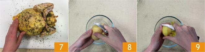 Massageie bem para que os sabores penetrem de forma uniforme 7, depois unte a superfície. Passe para as batatas: descasque-as 8 e torneie-as com uma faquinha 9.