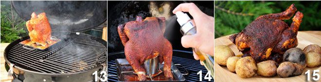 Uma vez que as brasas estão acesas, fecha-se a tampa e atua-se nas entradas de ar para estabilizar a temperatura. Alcançada a temperatura desejada, pode-se iniciar a cozimento do Beer Can Chicken. Primeiro, as lascas são jogadas diretamente nas brasas através de uma janela presente na grelha do alimento. Levanta-se a portinhola e, com uma mola ou 'pinça' para churrasco, colocam-se as lascas para queimar 12. Será necessário inserir uma quantidade mínima de lascas, todas aquelas que cabem em uma mão, por assim dizer. Fecha-se novamente a tampa e aguarda-se que as lascas de madeira aromática comecem a produzir fumaça.