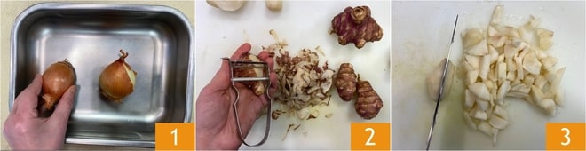 Para preparar o frango com caqui e alcachofra-de-jerusalém, coloque primeiro as cebolas inteiras em uma assadeira e asse a 230°C por 25 minutos 1. Passe para a alcachofra-de-jerusalém: descasque os tubérculos 2, depois lave-os e corte em cubos 3.