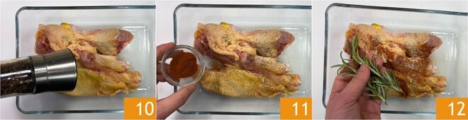 Enquanto isso, prepare o frango: coloque o frango em pedaços em uma assadeira e tempere com sal, pimenta 10, páprica 11 e alecrim 12.