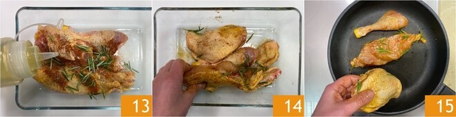 Tempere com óleo 13 e massageie bem a carne para temperá-la de maneira uniforme 14. Coloque os pedaços de frango em uma frigideira antiaderente 15.