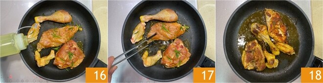 Adicione um fio de óleo 16 e doure em fogo alto por 4-5 minutos, virando o frango de ambos os lados com pinças de cozinha 17. Em seguida, abaixe o fogo e continue cozinhando em fogo médio-baixo por cerca de 30 minutos, virando-o frequentemente 18.