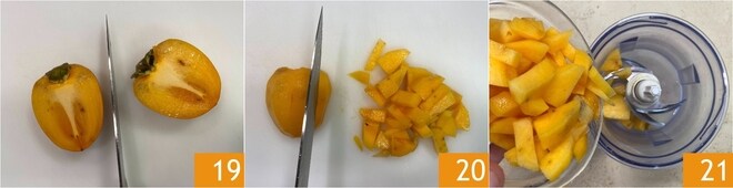 Enquanto isso, corte o caqui ao meio 19 e descasque-o, depois corte-o em cubos 20 e transfira para um mixer 21.