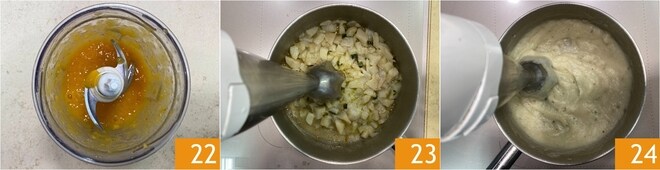 Bata até obter um molho de consistência homogênea 22 e reserve. Retome a alcachofra-de-jerusalém que, a esta altura, estará cozida e bata com um mixer de imersão 23 para transformá-la em creme 24. Mantenha aquecido.