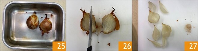 Após o tempo de cozimento, retire as cebolas do forno 25 e corte ao meio no sentido do comprimento 26, depois separe as pétalas 27.