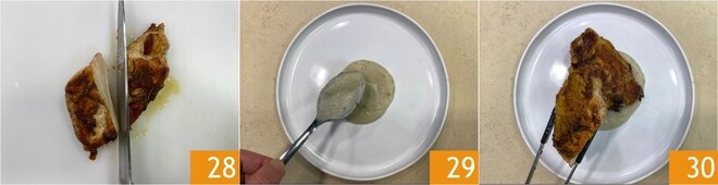 Está pronto para montar o prato: corte ao meio os pedaços de frango maiores 28, depois distribua uma colher de creme de alcachofra-de-jerusalém na base do prato 29 e coloque os pedaços de frango por cima 30.