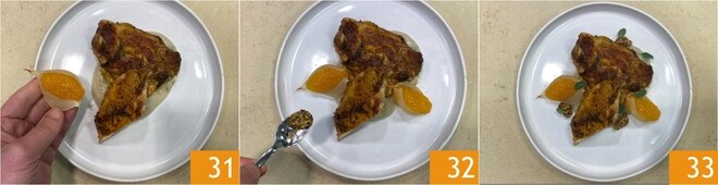 Preencha um par de pétalas de cebola com o molho de caqui e coloque ao lado do frango 31, em seguida, decore com uma colher de chá de mostarda 32 e algumas folhas de manjerona. Seu frango com caqui e alcachofra-de-jerusalém está pronto para ser servido 33!