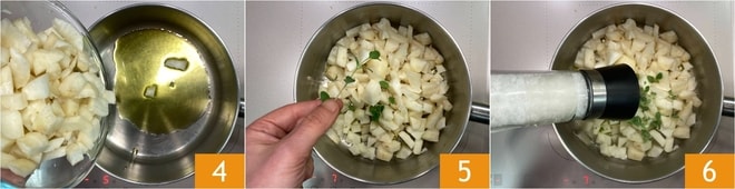 Coloque a alcachofra-de-jerusalém em uma panela com um fio de azeite 4, as folhas de manjerona 5, sal 6 e pimenta.
