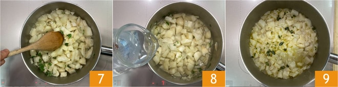 Deixe apurar por alguns minutos em fogo baixo 7, depois adicione a água 8 e cozinhe por cerca de 20 minutos 9.