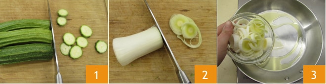Para preparar o frango com creme de abobrinha, primeiro prepare o caldo seguindo nossa receita de Caldo de legumes. Lave as abobrinhas, depois retire as pontas e corte-as em rodelas finas 1. Remova as folhas externas do alho-poró e corte-o também em fatias finas 2. Aqueça um fio de azeite em uma panela, em seguida coloque o alho-poró 3.