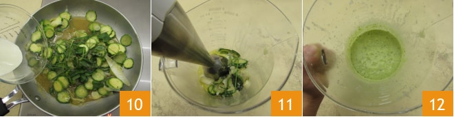 Agora incorpore o creme de leite 10, transfira as abobrinhas para um copo alto e bata com o mixer de imersão 11 para obter um creme homogêneo 12. Reserve.