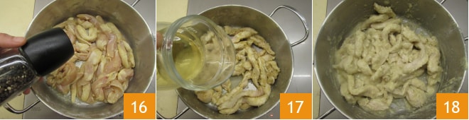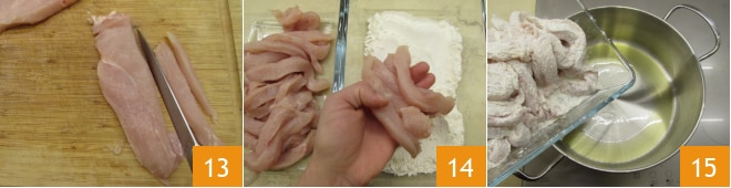 Corte o peito de frango em tiras 13, enfarinhe-as cuidadosamente 14. Aqueça um fio de azeite em uma frigideira, depois coloque as tiras de frango 15.