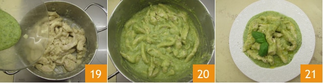 Adicione também o creme de abobrinha 19, salteie na panela por cerca de 5-8 minutos para misturar e temperar. Sirva o frango com creme de abobrinha bem quente com um fio de azeite cru 21.
