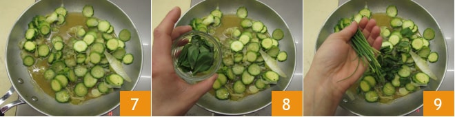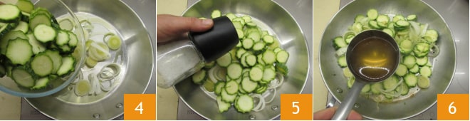 Adicione também as abobrinhas 4, salgue 5 e apimente e refogue em fogo moderado por 4-5 minutos. Depois, adicione o caldo 6 e continue cozinhando por 10 minutos em fogo médio-baixo.