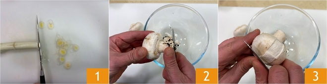 Para preparar o frango com creme de cogumelos e endívia, primeiro faça o creme de champignon. Corte o alho-poró em rodelas 1, depois passe para a limpeza dos cogumelos. Retire a terra da base 2 e pele os cogumelos 3.