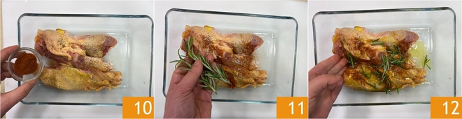 Coloque os pedaços de frango em uma tigela, tempere com sal, pimenta-do-reino e páprica 10. Acrescente os raminhos de alecrim 11, um fio de azeite e massageie o frango 12.