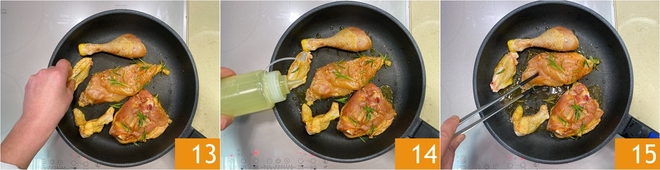Aqueça uma frigideira e coloque os pedaços de frango, com a pele voltada para baixo 13. Deixe dourar, acrescente mais um fio de azeite 14 e vire os pedaços de frango 15. Doure bem, depois abaixe o fogo e cozinhe por cerca de 20 minutos.