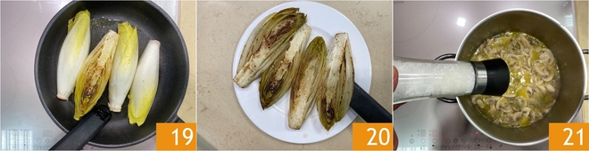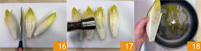 Enquanto isso passe para a endívia. Lave-a e corte-a ao meio 16. Tempere com sal e pimenta 17. Em uma frigideira coloque um fio de azeite, aqueça e disponha a endívia no interior 18.