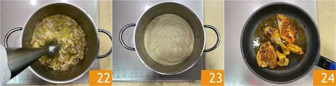 Bata com um mixer de imersão 22 até obter um creme 23. A essa altura o frango também estará pronto, devendo ficar bem dourado 24.