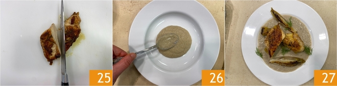 Corte ao meio os pedaços maiores 15 e monte o prato colocando o creme no fundo 16. Disponha por cima o frango, a endívia e decore com endro 27.