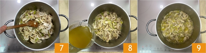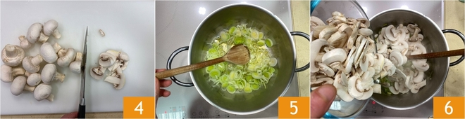 Em seguida corte-os em fatias 4. Coloque na panela um fio de azeite e o alho-poró 5, deixe-o murchar em fogo médio e depois junte os cogumelos 6.
