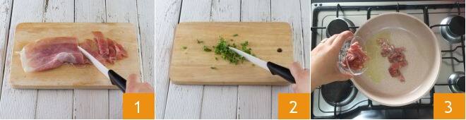 Para preparar o frango com presunto cru ao tomate, comece sobrepondo as fatias de presunto uma sobre a outra. Em seguida, corte-o em tiras de 2 cm 1. Pique também a salsinha e reserve 2. Depois, despeje um fio de azeite em uma panela, adicione o presunto cru 3