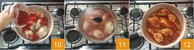Aguarde cerca de 3 minutos, depois adicione a polpa de tomate 10, tempere com sal, mexa e cubra com uma tampa 11. Deixe cozinhar por mais 50 minutos em fogo baixo. O frango com presunto cru e tomate está pronto para ser servido 12.